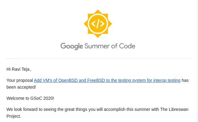 My application(formally know as proposal) for GSoC 2020 got accepted with Libreswan.