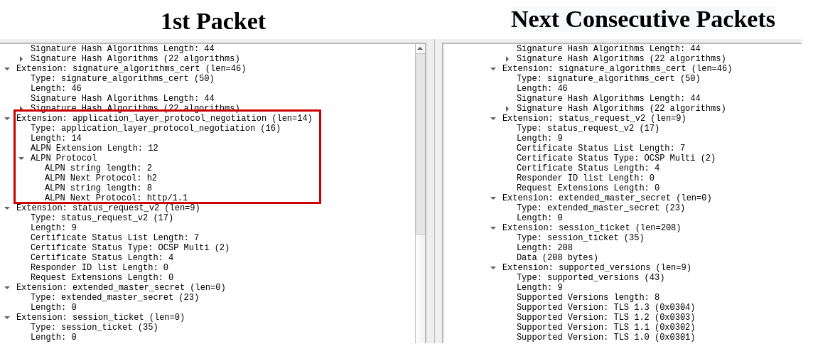 Here is the actual difference of the packets from Wireshark(Extensions filed part of the ClientHello packet)