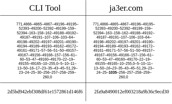 ja3er.com — This website should not be used to find your JA3 fingerprint since it gives a false JA3 value as outlined in this Github Issue and this tweet. To give you an idea, you can check differences as shown below: